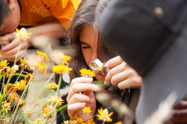 An experienced RBGV Biomimicry Educator encourages students to use their senses to explore plant adaptations.